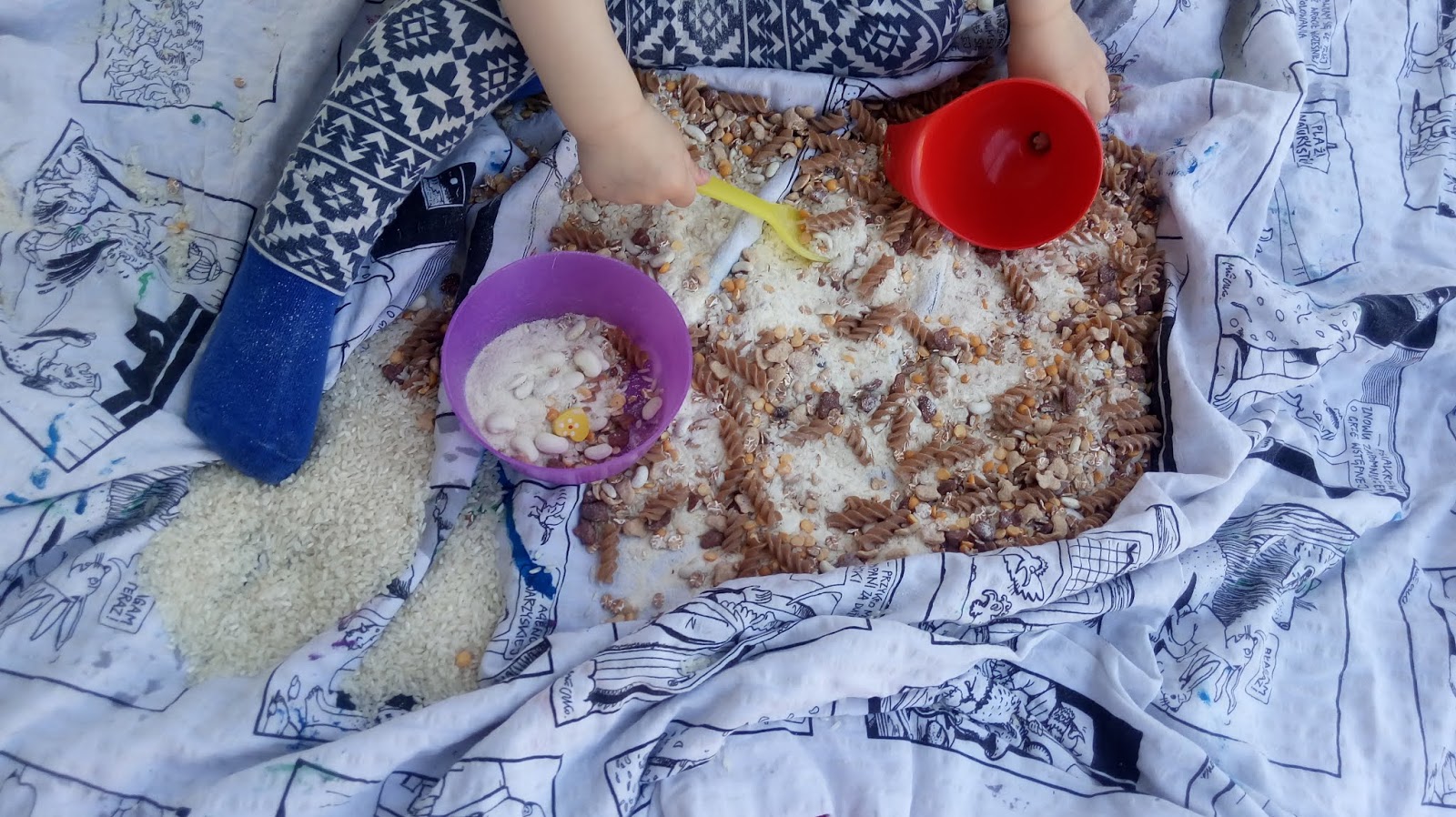 - Daj dziecku... miskę ryżu, makaronu, fasoli, etc. Oczywiście będzie po tym trochę sprzątania, ale pamiętaj, że sterylny porządek nie jest tu kluczowy - później możecie przecież razem pozamiatać. Jeśli maluch dopiero zaczyna takie sensoryczne zabawy, pewnie ograniczy się do prześcieradła czy koca, który podłożysz pod tę zabawę, posprzątanie będzie więc łatwe. Dopiero później zacznie testować opcje rzucania ryżem po każdej dostępnej powierzchni (wiem co mówię 😄)